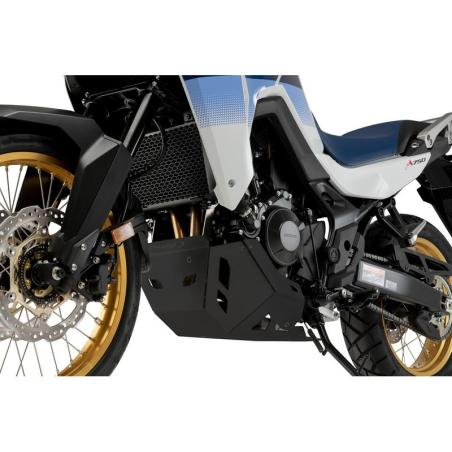 The lower part of the protector is completely flat, which makes it easier to lift the motorcycle from the lower part in the mechanical workshop if necessary, and it has holes to guarantee good cooling and to evacuate water, mud, or small accumulated stones.