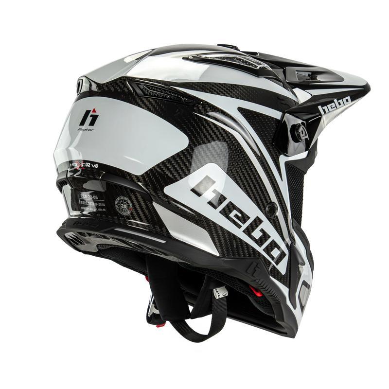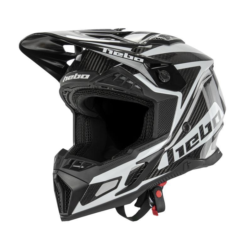 Casco Hebo ligero (1200 g ±50 g) con fibra de vidrio y refuerzos de carbono, visera PA66 regulable sin herramientas, interior Silver Plus + Dry-Lex desmontable y lavable, ventilación completa y homologación ECE 22-06.